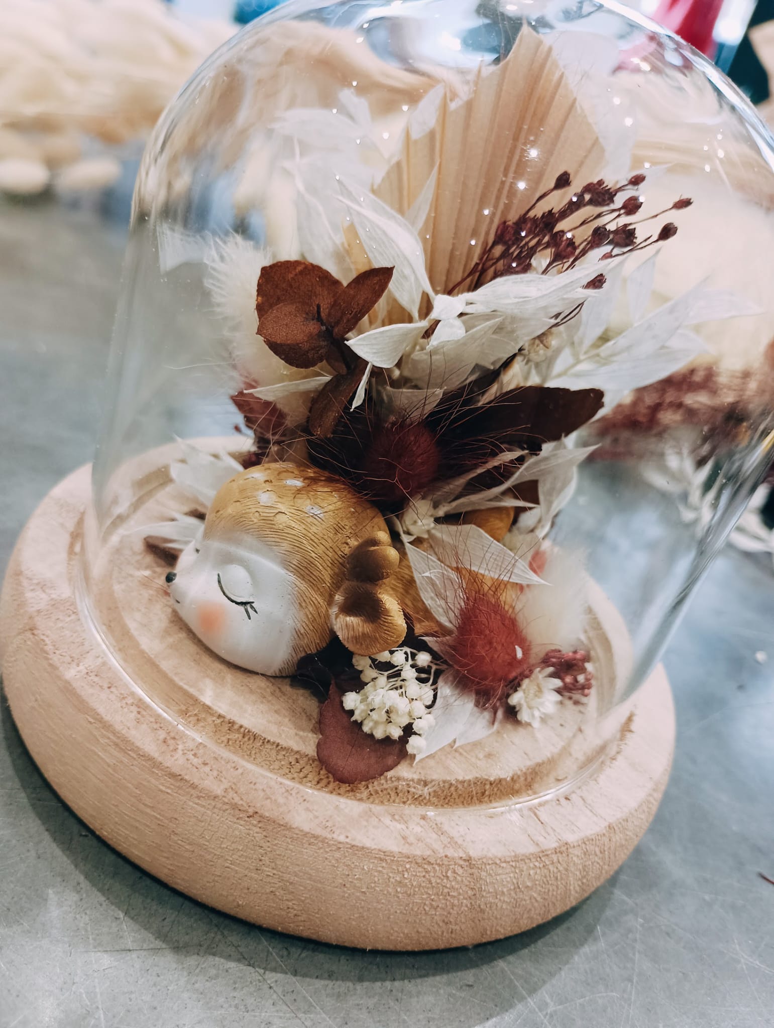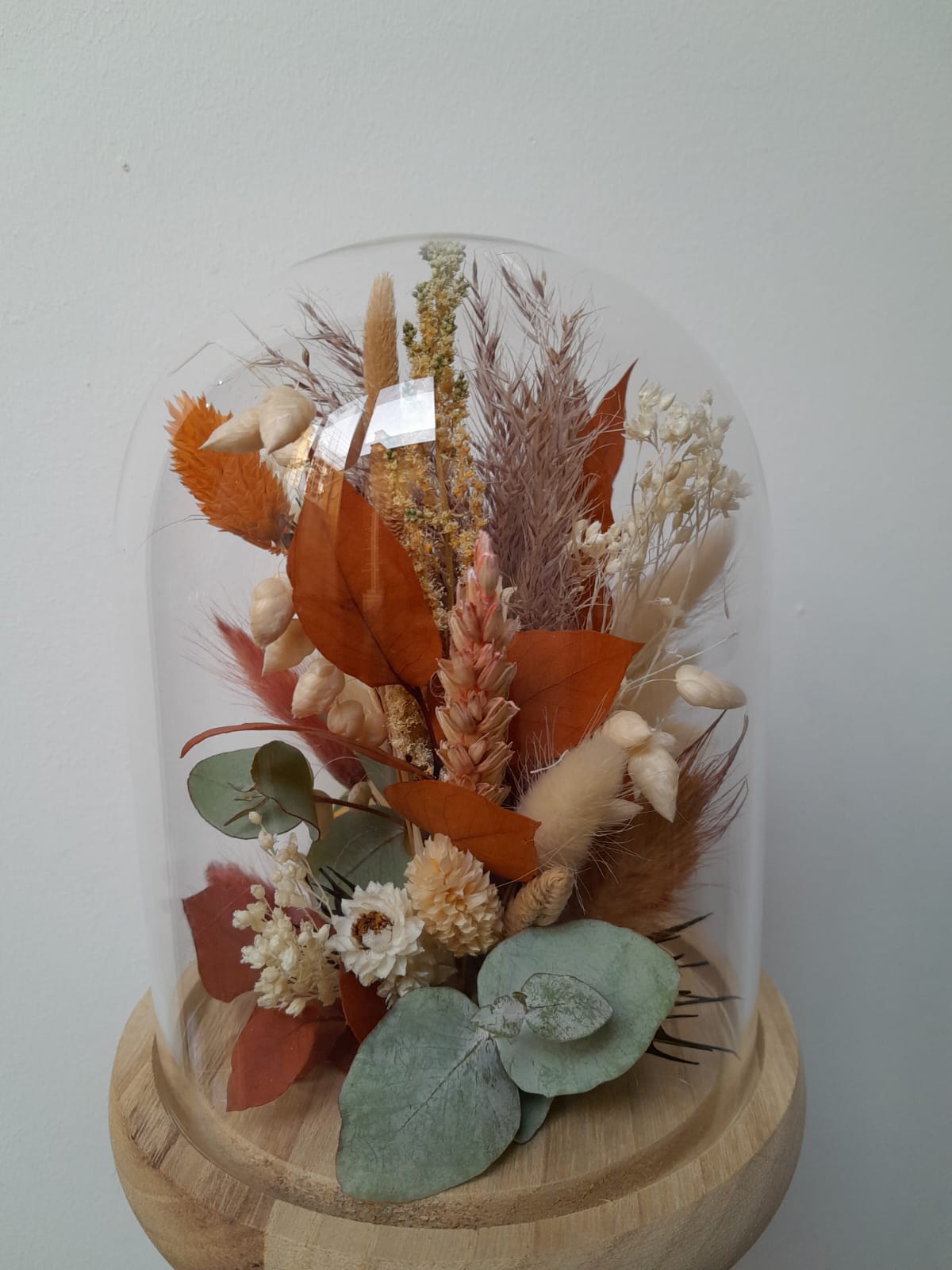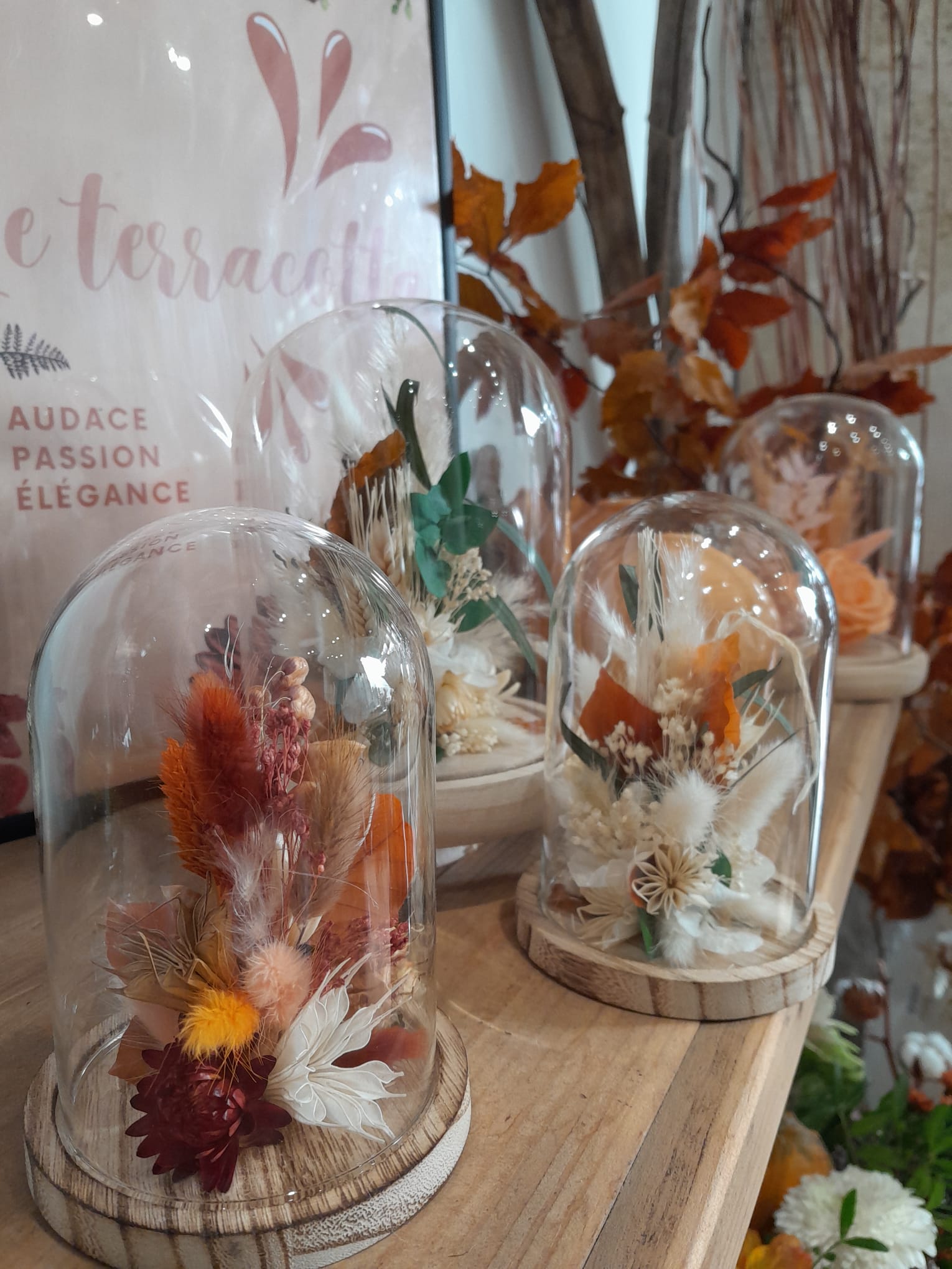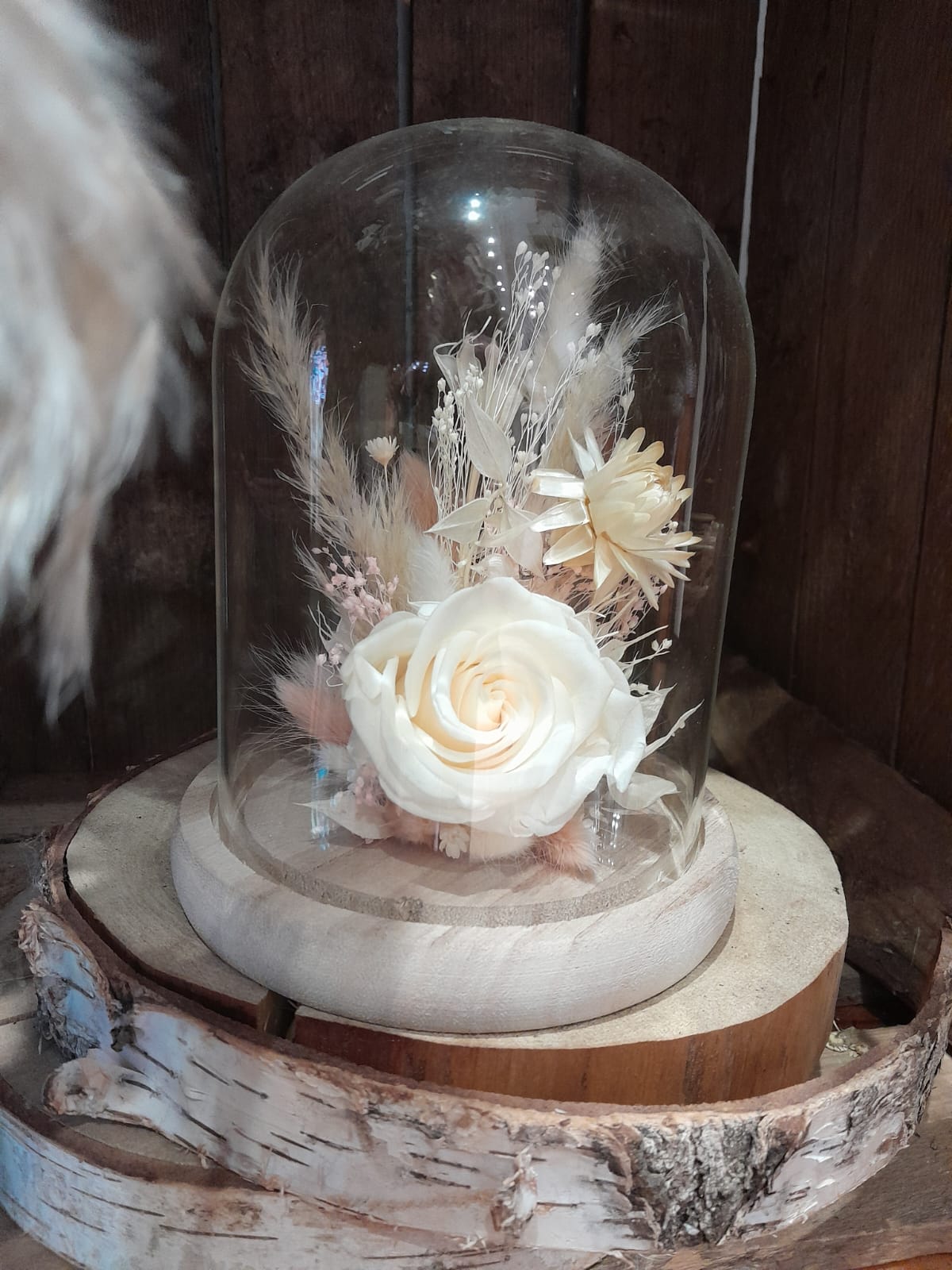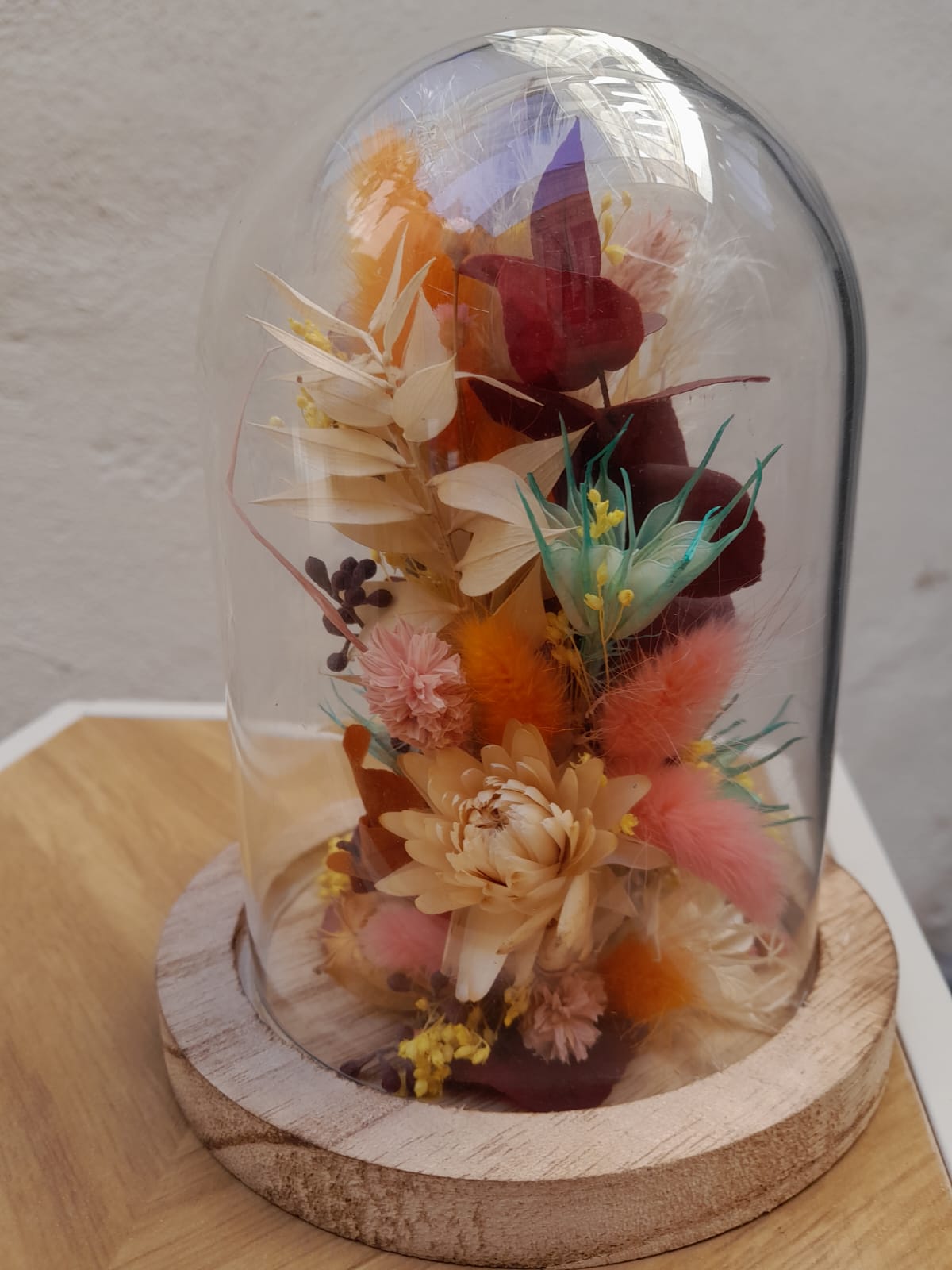 Ces cloches de fleurs séchées sont confectionnées en magasin par nos artisans fleuristes. Plusieurs coloris sont disponibles pour cette taille et visibles en boutique.