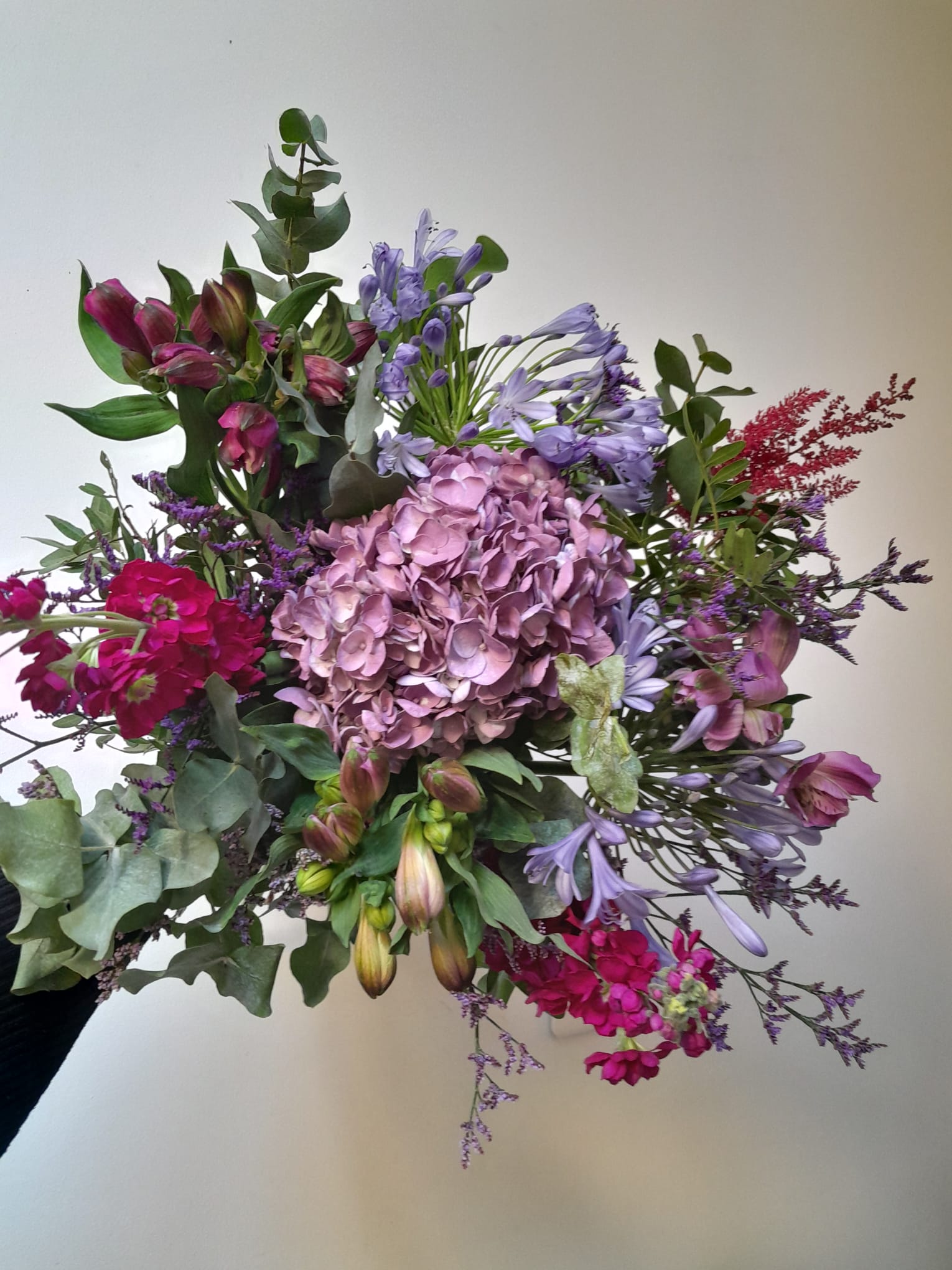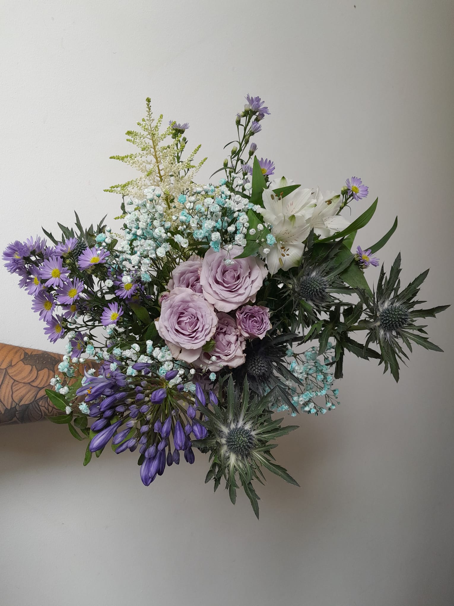 Bouquet violet et bleu (compassion, spiritualité, vérité) à partir de 35 €.