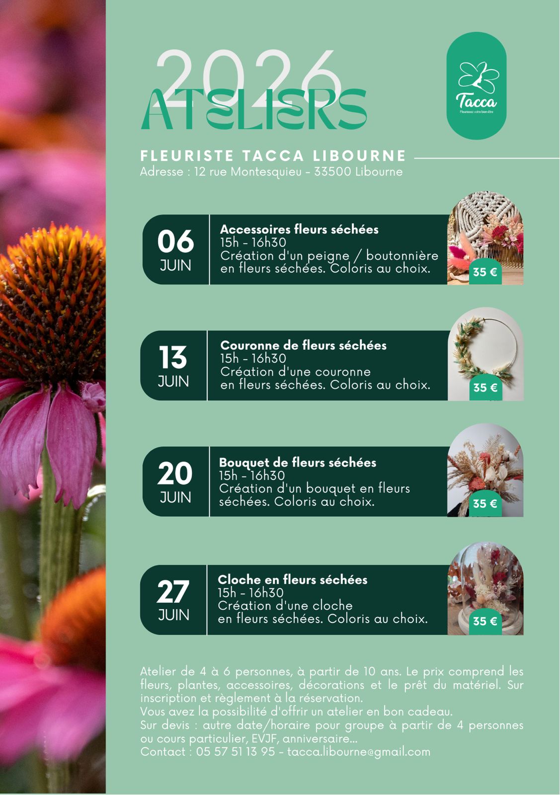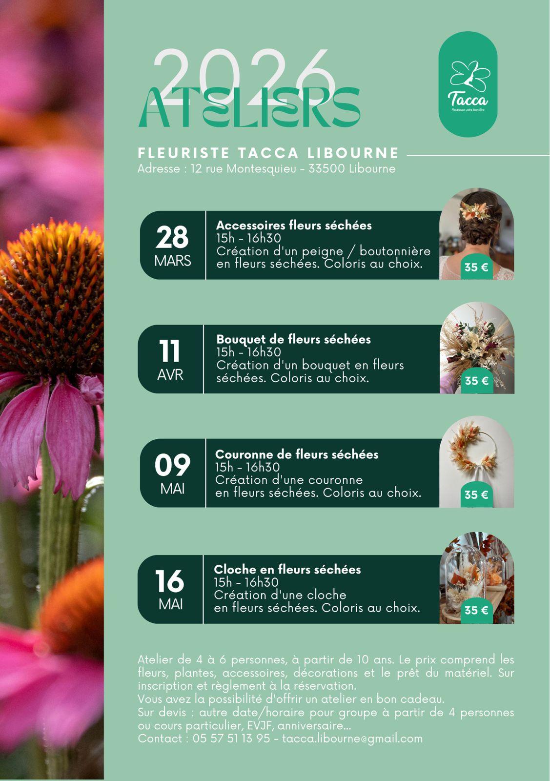 Atelier de 4 à 6 personnes, à partir de 8 ans. Le prix comprend les fleurs, accessoires, décorations et le prêt du matériel. Sur inscription et règlement à la réservation.