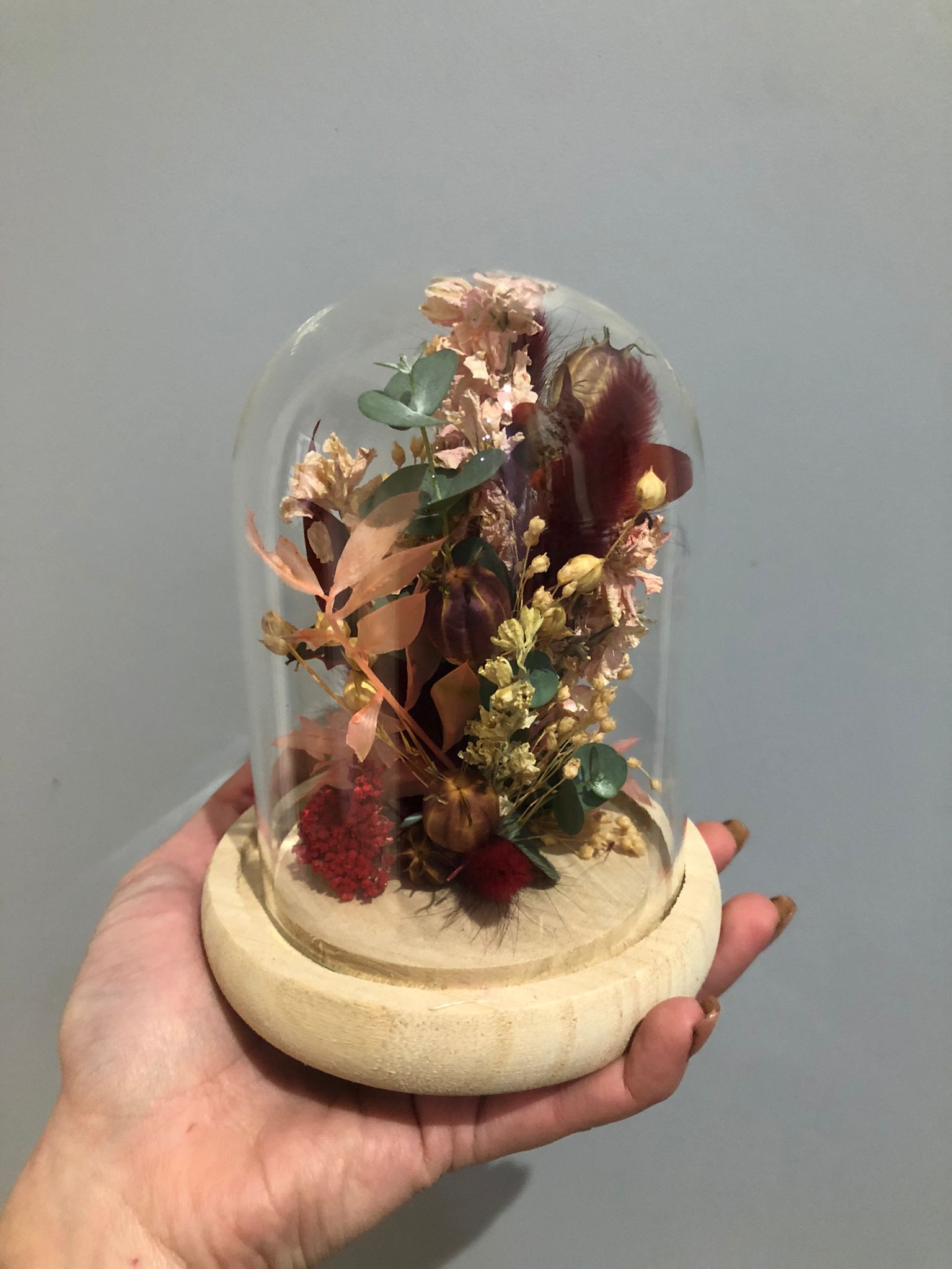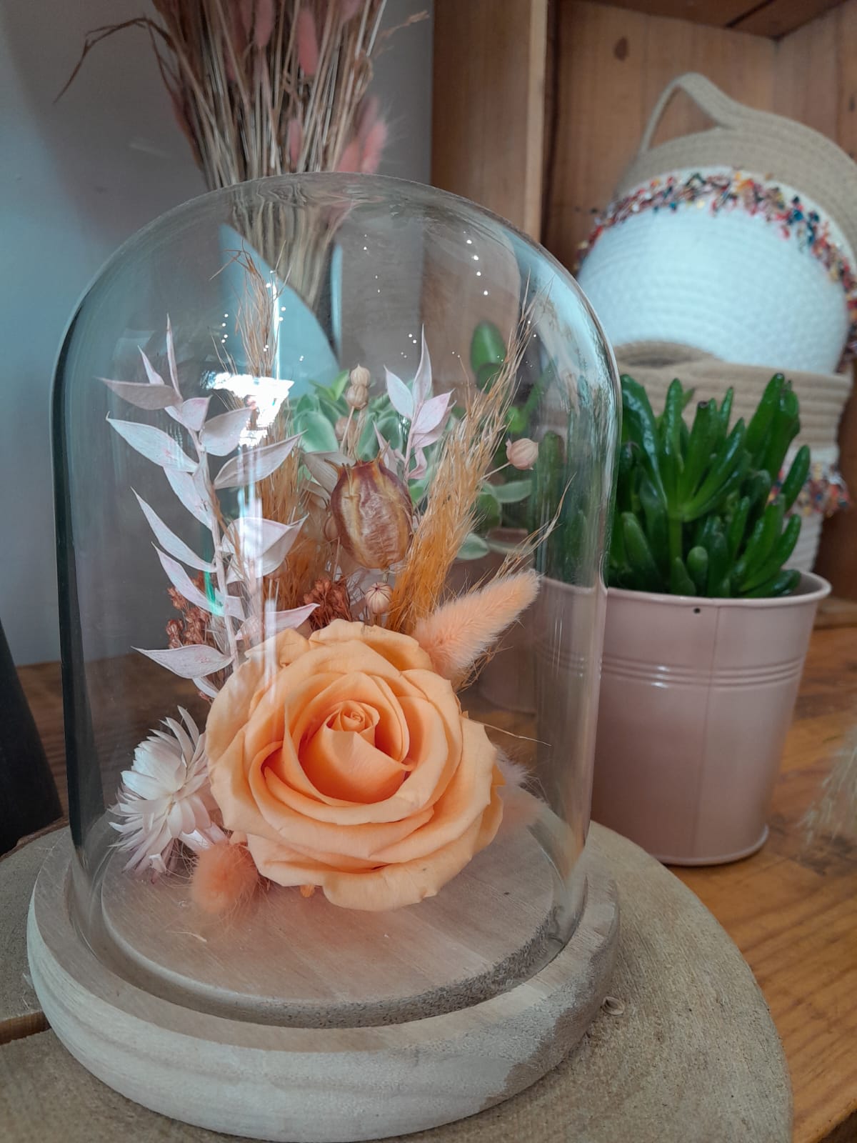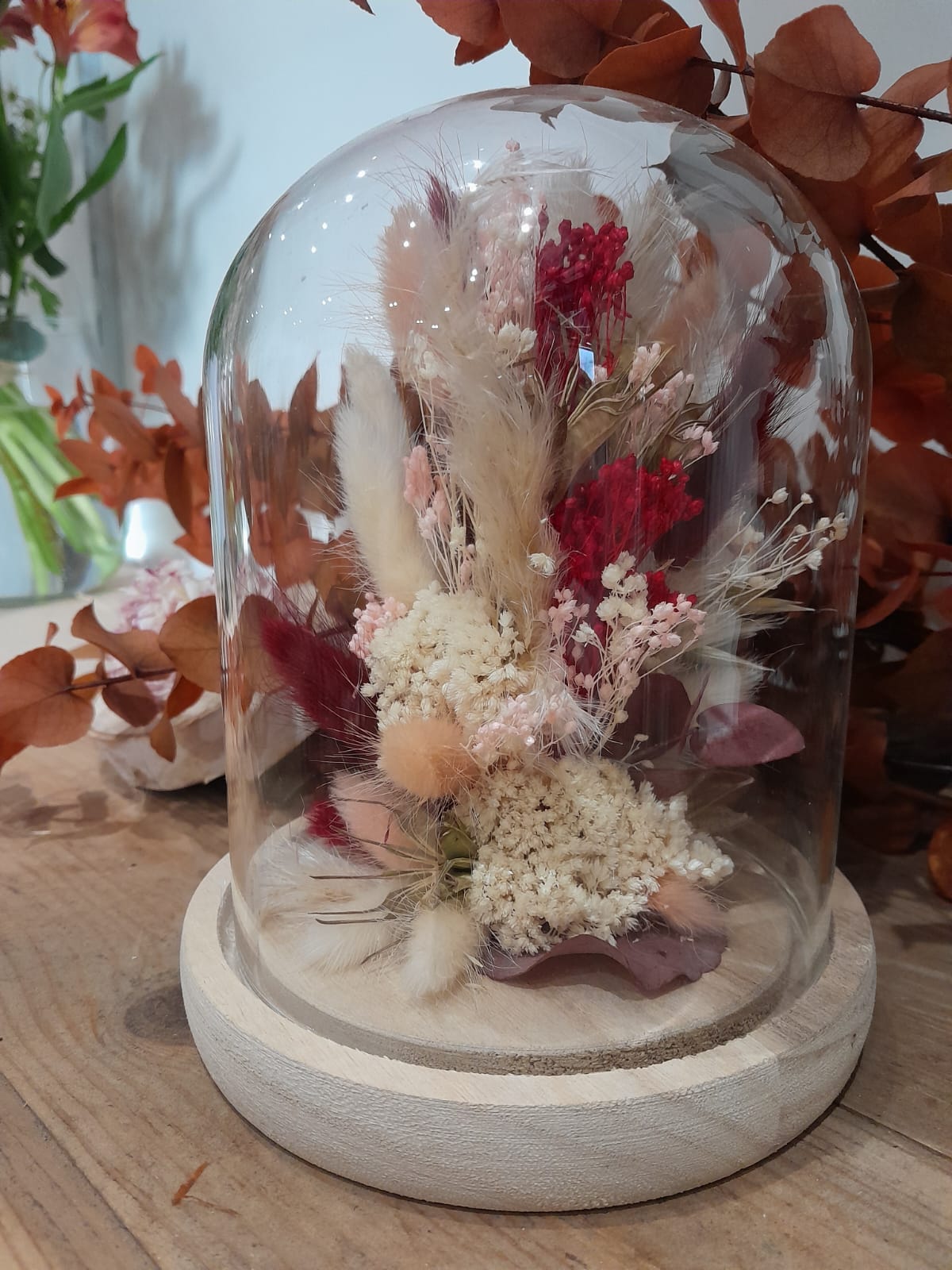 Ces cloches de fleurs séchées sont confectionnées en magasin par nos artisans fleuristes. Plusieurs coloris sont disponibles pour cette taille et visibles en boutique.