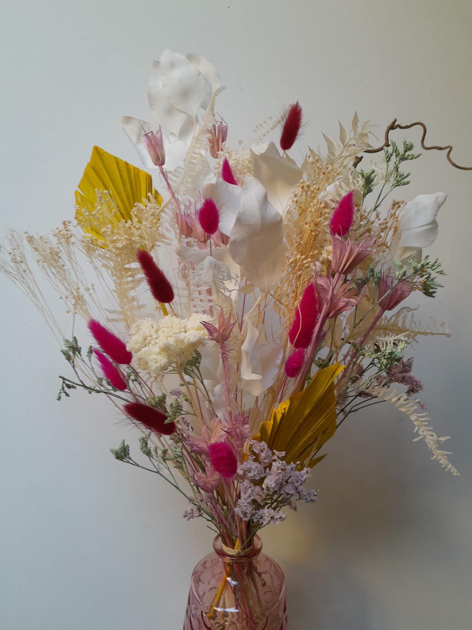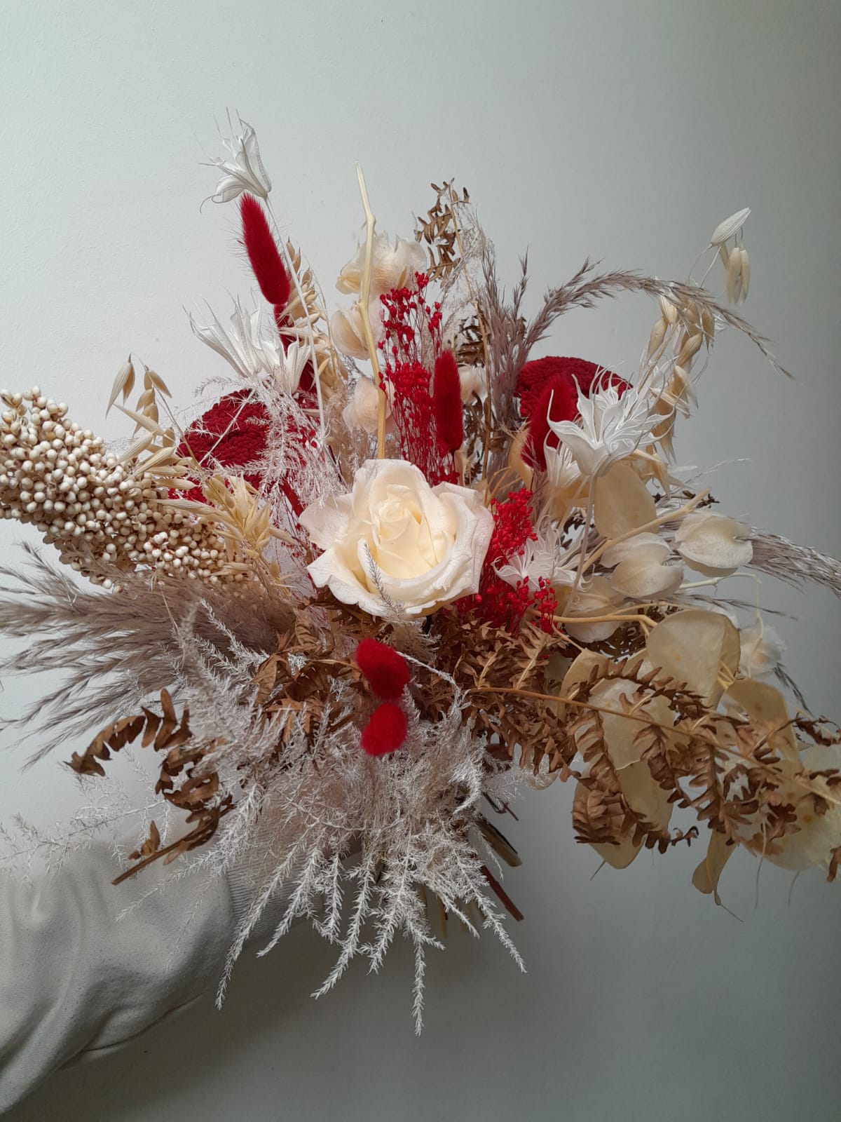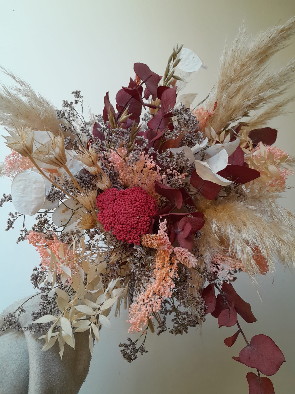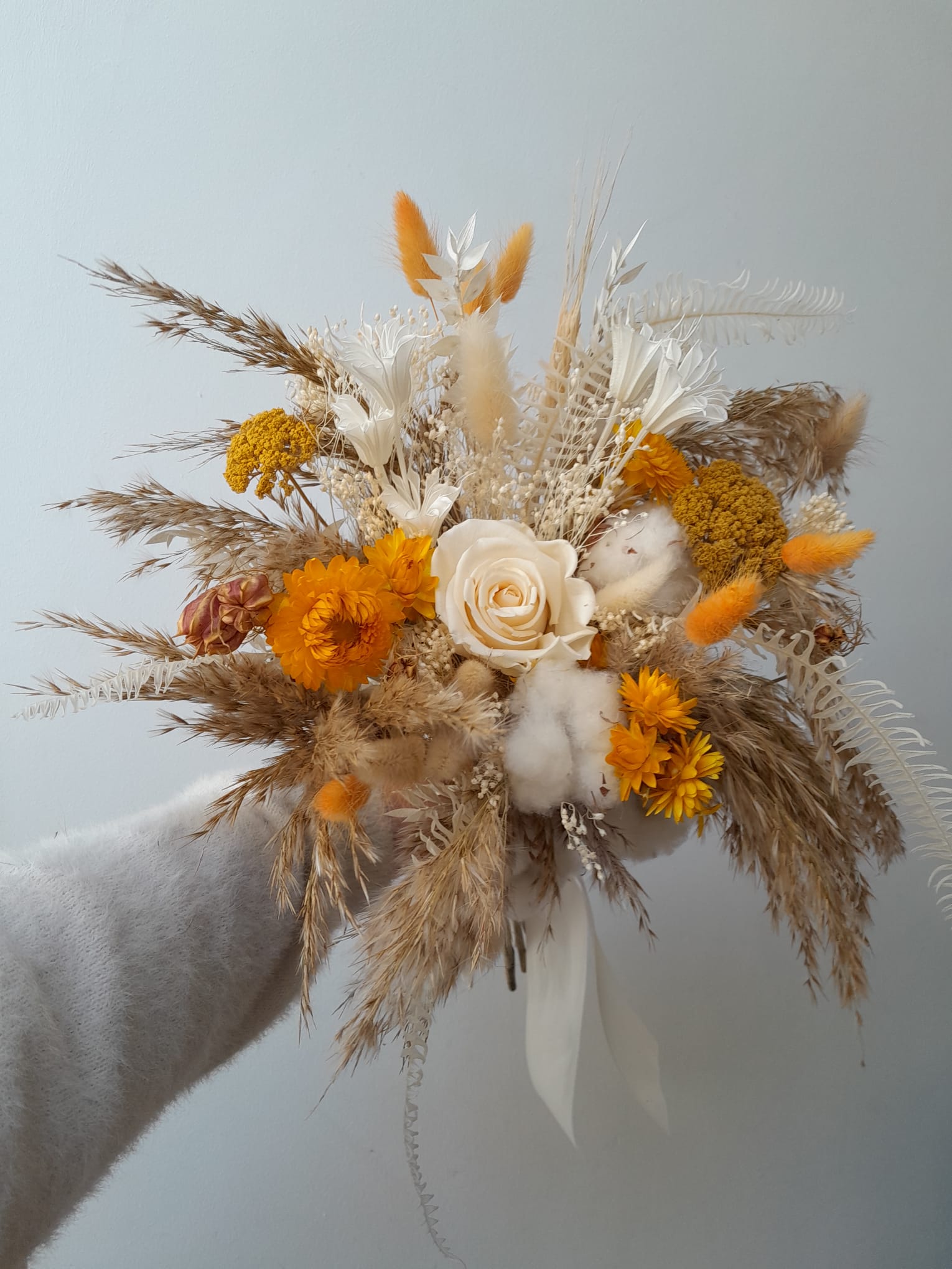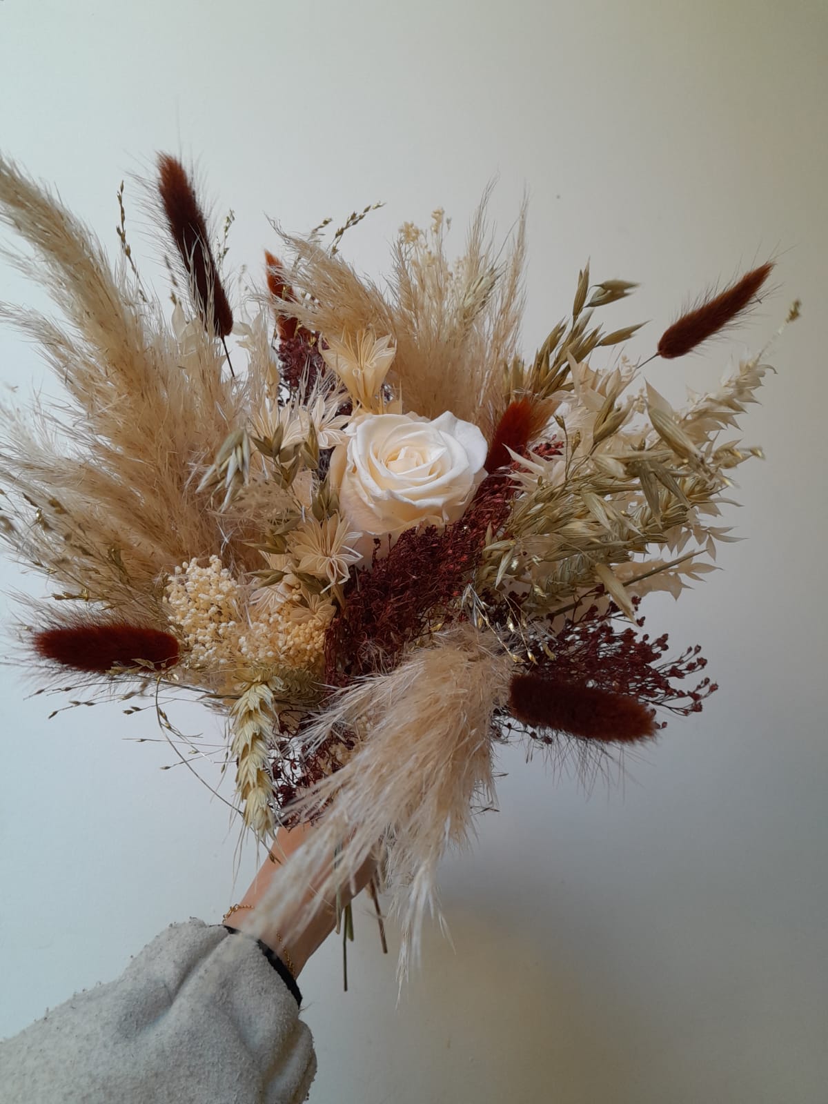 Chaque création est réalisée avec des fleurs séchées, sélectionnées selon nos arrivages. Photo non contractuelle: les teintes seront respectées, mais chaque bouquet est unique.