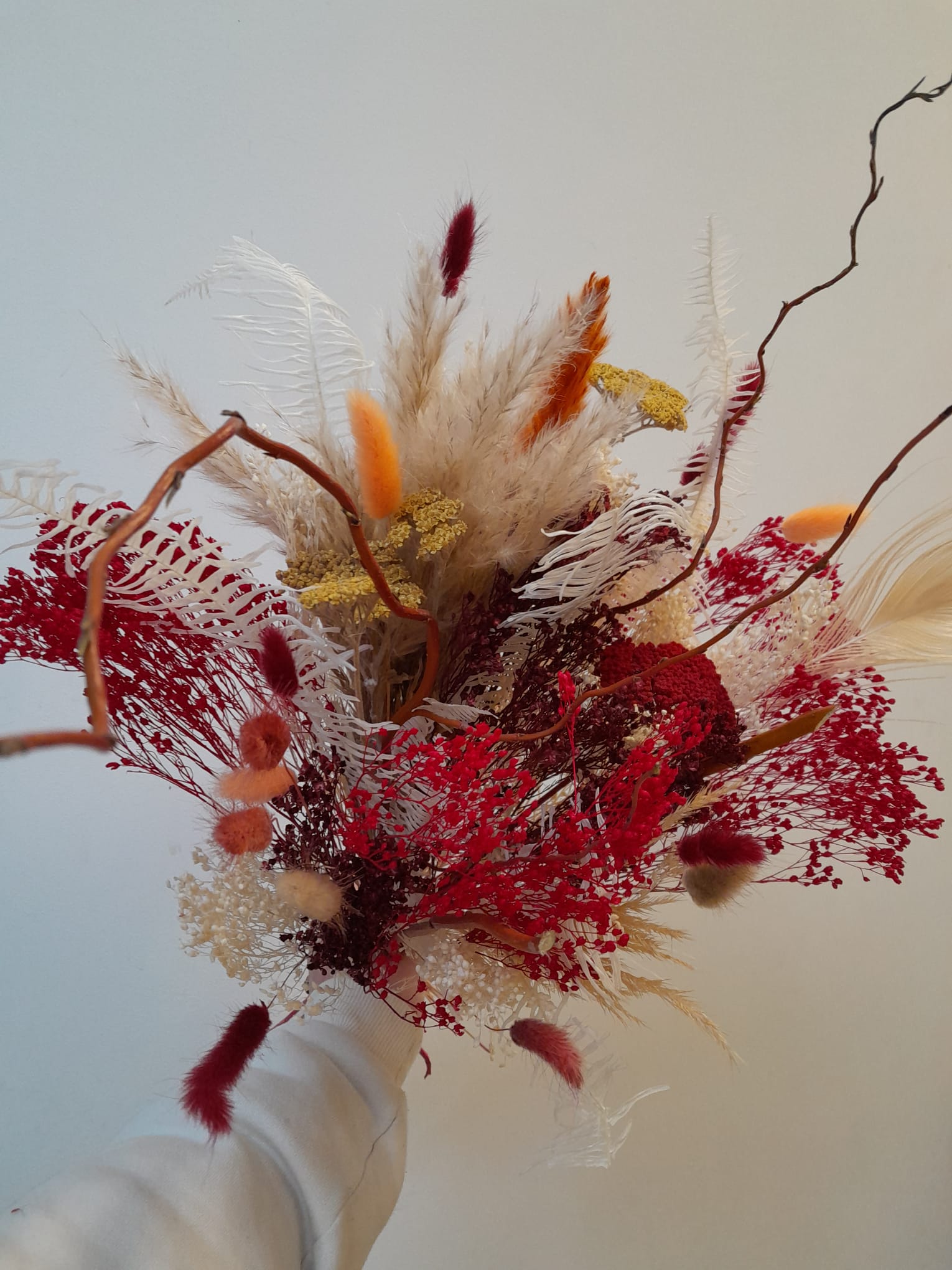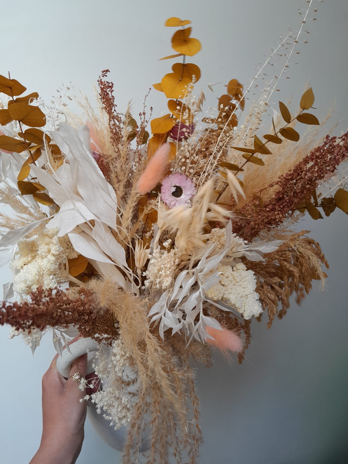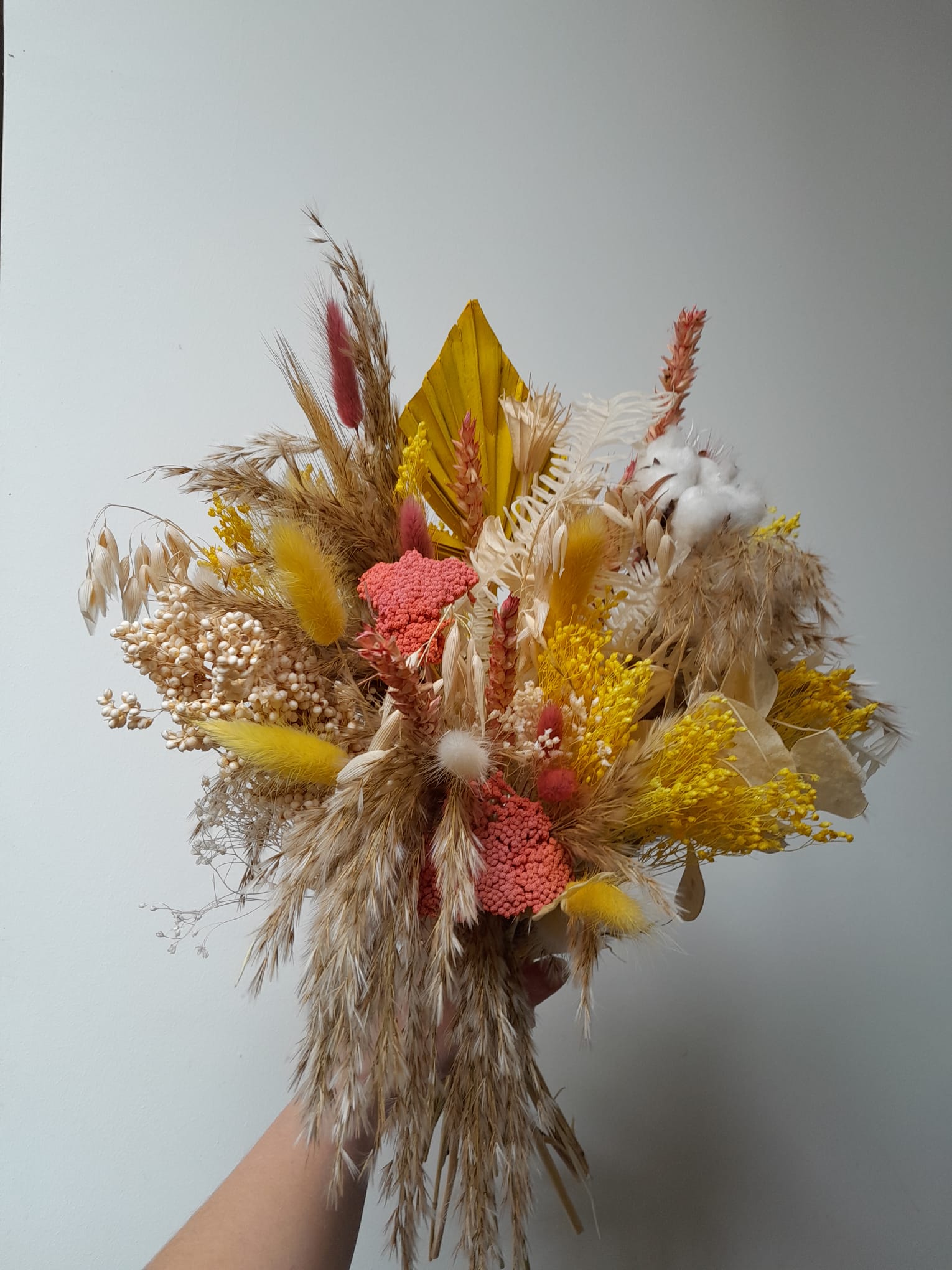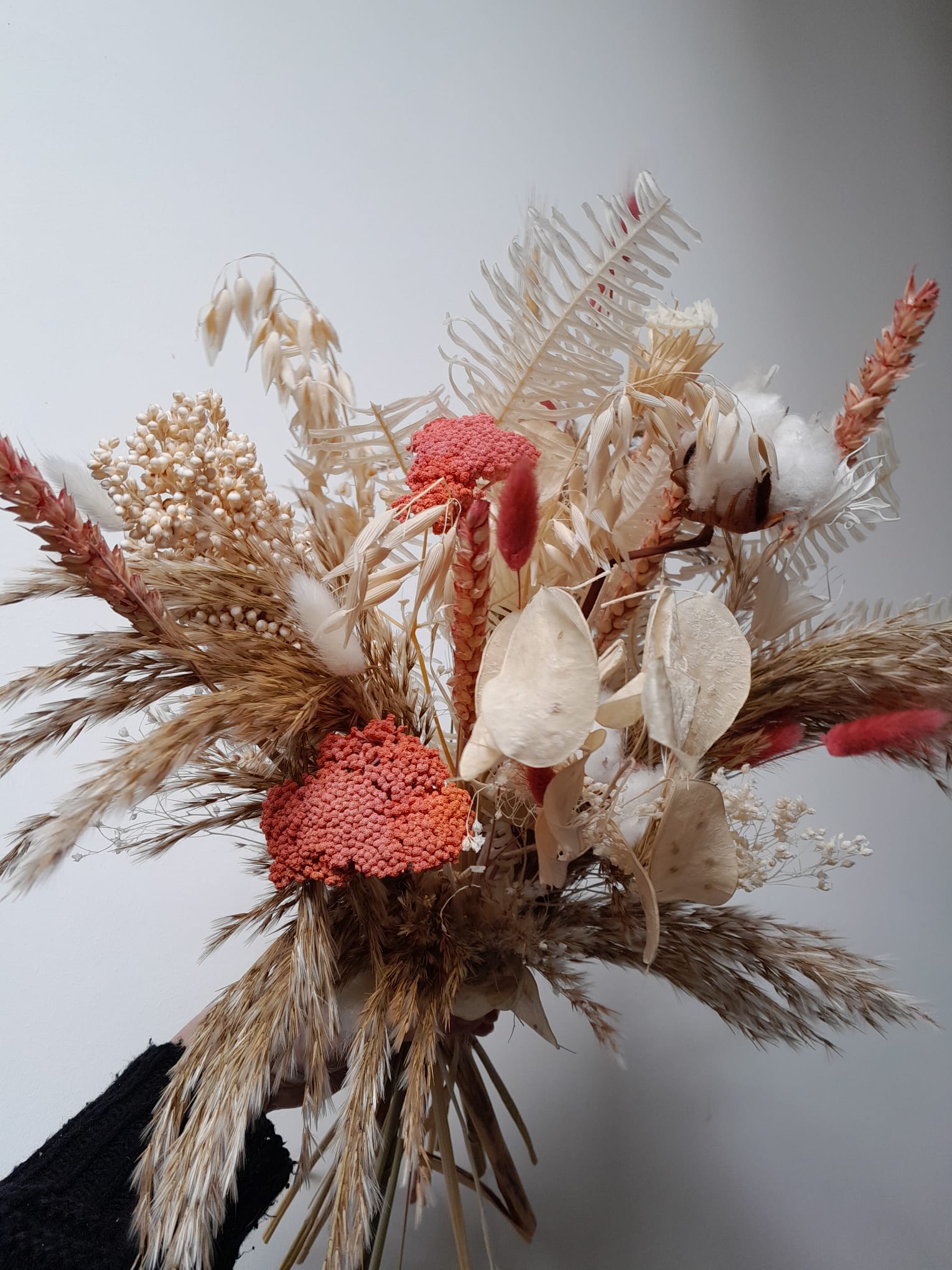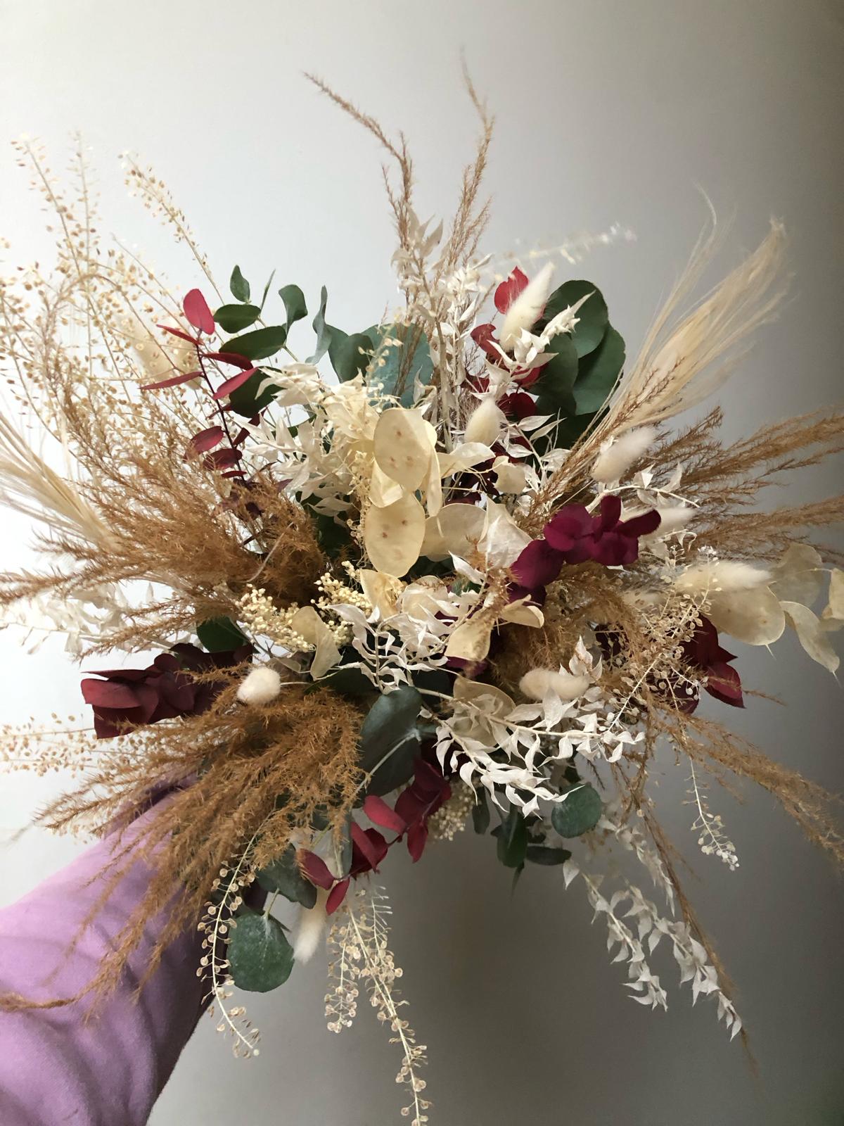 Chaque création est réalisée avec des fleurs séchées, sélectionnées selon nos arrivages. Photo non contractuelle: les teintes seront respectées, mais chaque bouquet est unique.