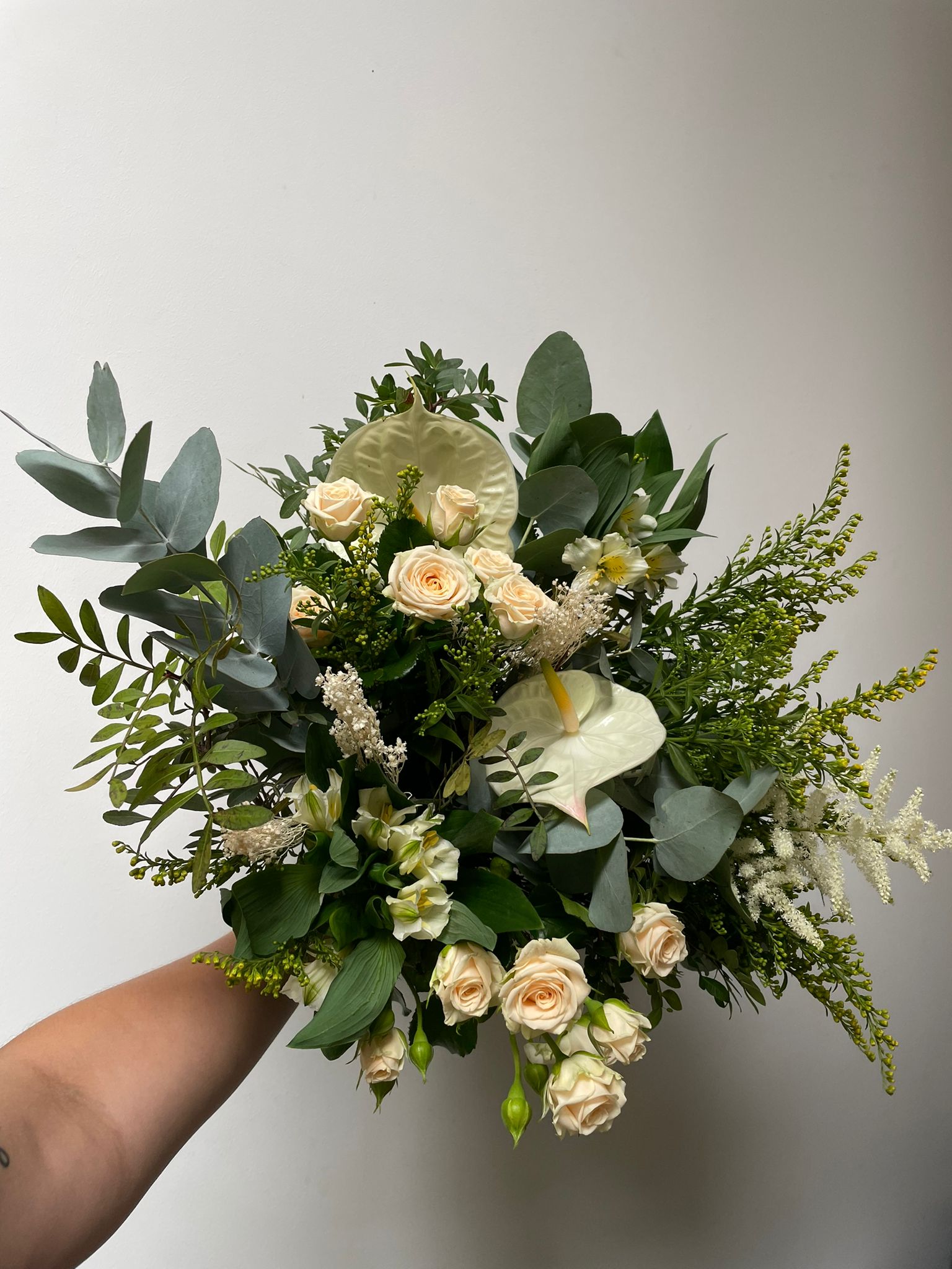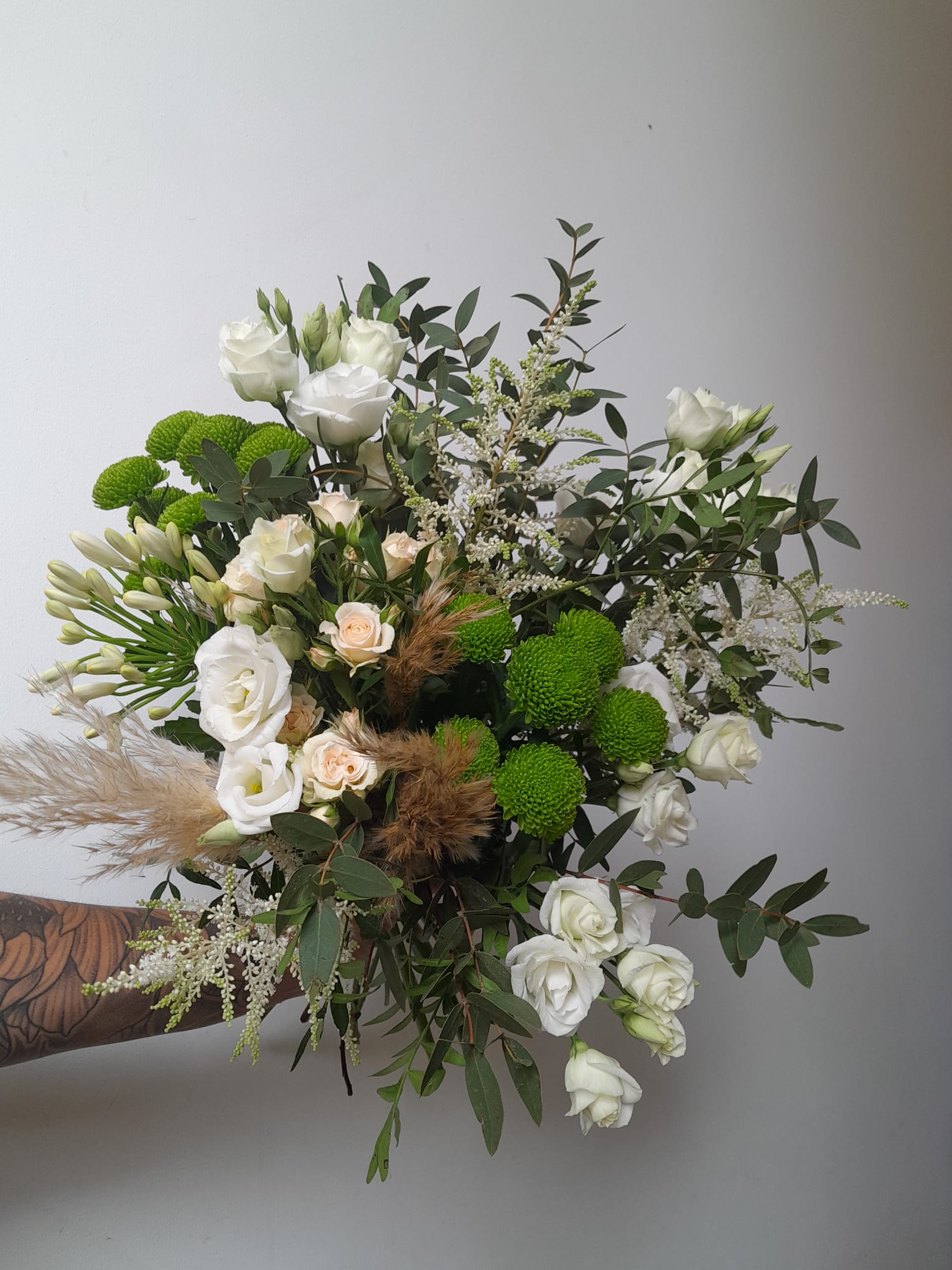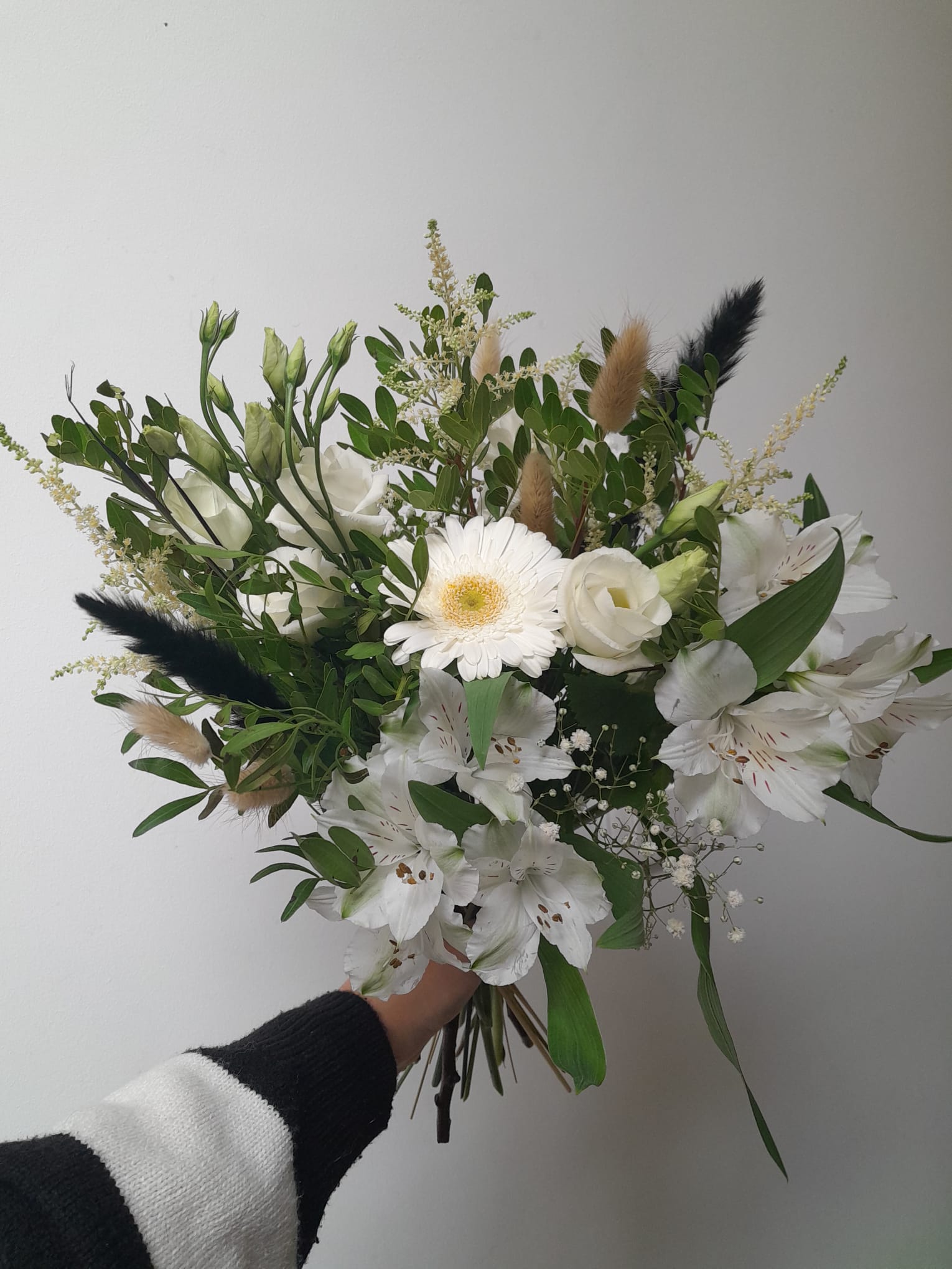 Bouquet blanc et vert (pureté, simplicité, innocence) à partir de 35 €.