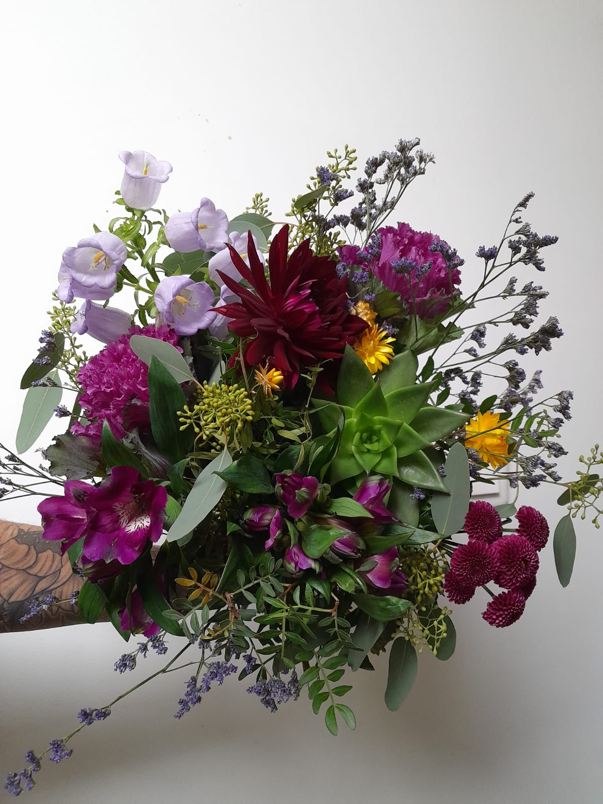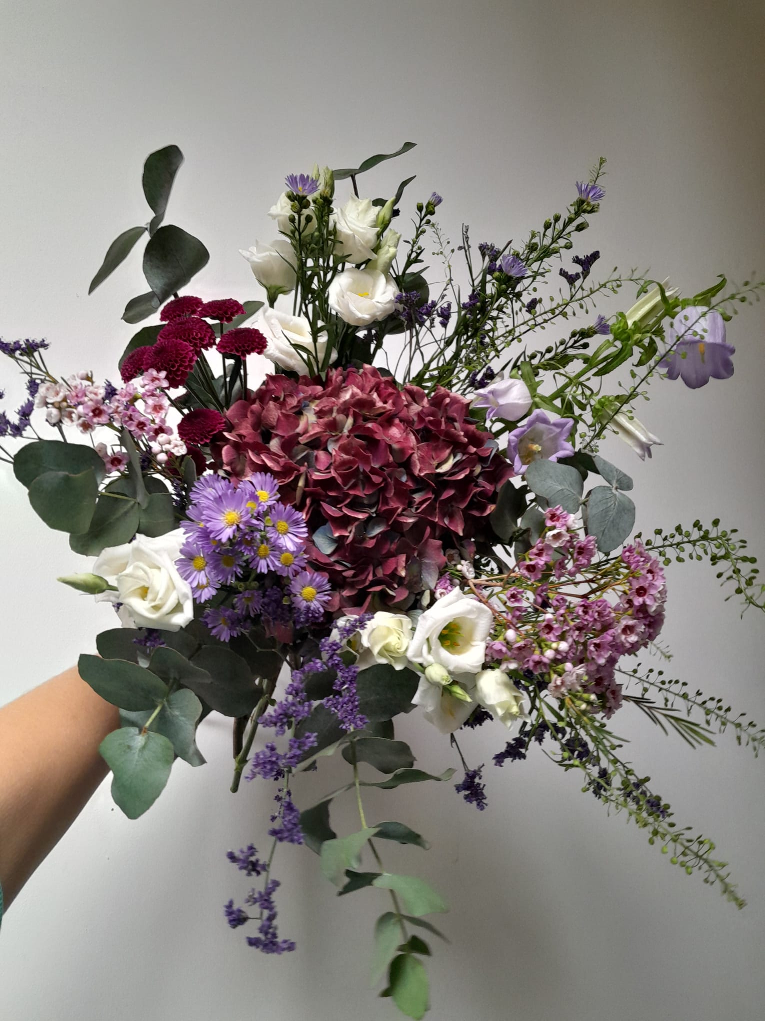 Bouquet violet et bleu (compassion, spiritualité, vérité) à partir de 35 €.