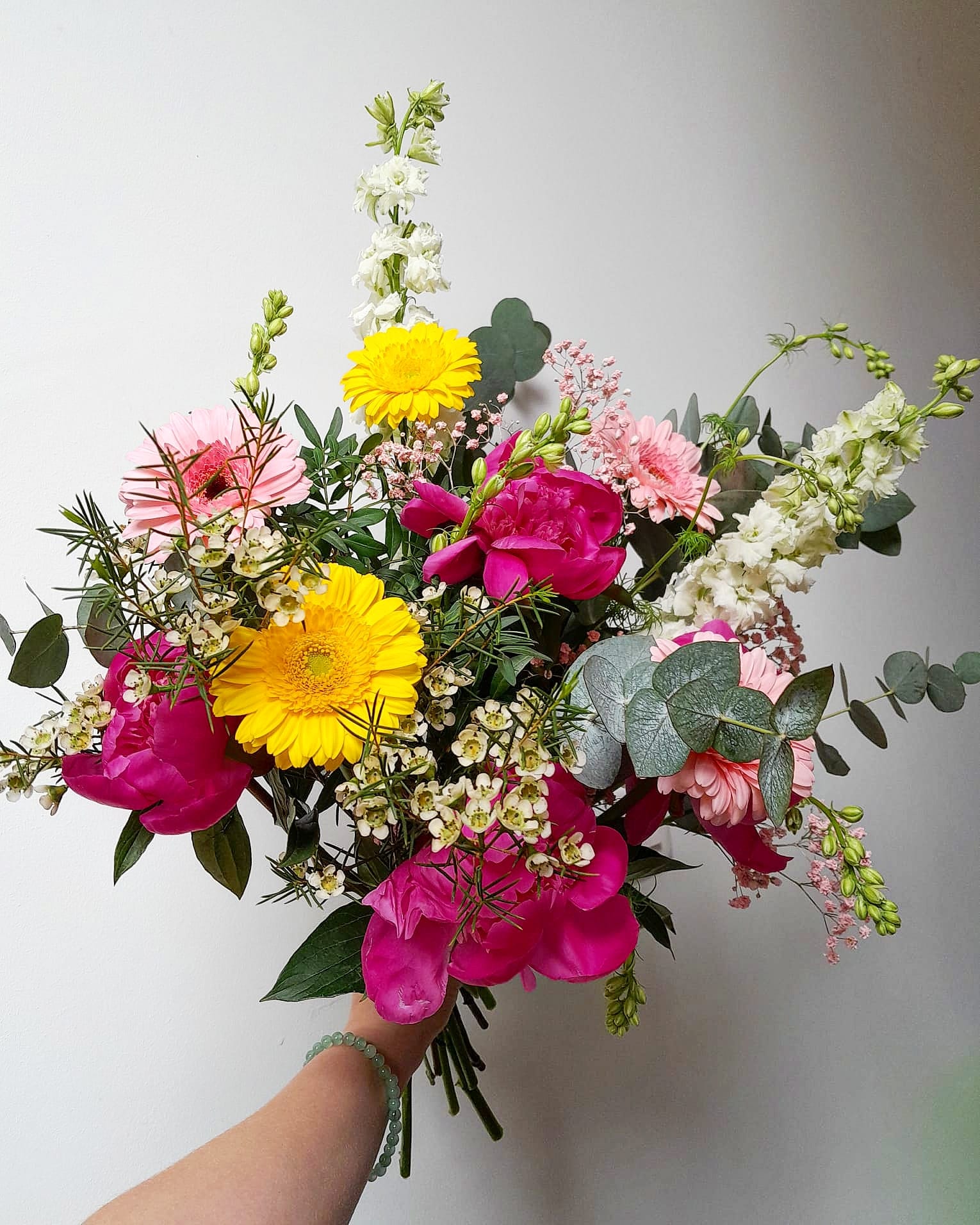 Bouquet rose et fuchsia (affection, bonheur, vitalité) à partir de 35 €.